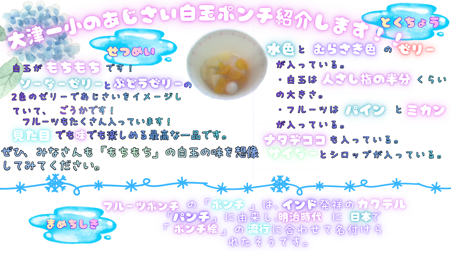 | 給食名 | あじさい白玉ポンチ |