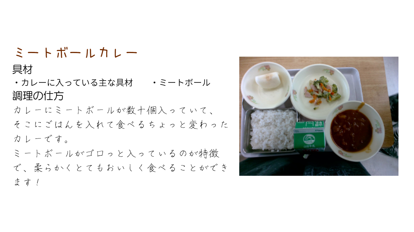 | 給食名 | ミートボールカレー |