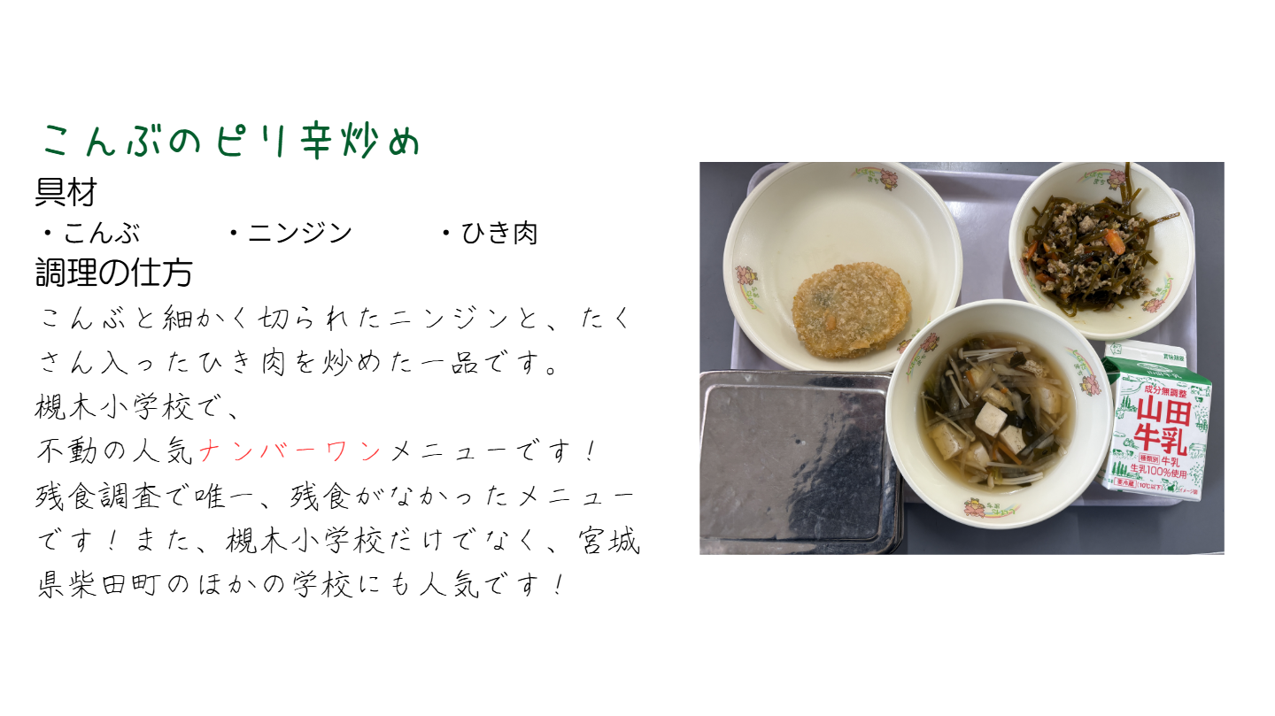 | 給食名 | こんぶのピリ辛炒め |